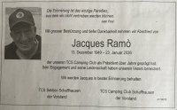 Mit großer Bestürzung haben wir heute vom Tod unseres geschätzten Vereinsmitglieds und Präsident des TCS Camping Club Schaffhausen Jacques Ramò erfahren. Sein Engagement und seine Leidenschaft haben unseren Verein viele Jahre bereichert. Wir werden ihn sehr vermissen und sein Andenken in Ehren halten. Weitere Informationen findet Ihr demnächst an dieser Stelle. Wir wünschen der Familie Ramò viel Kraft in dieser schwierigen Zeit.
